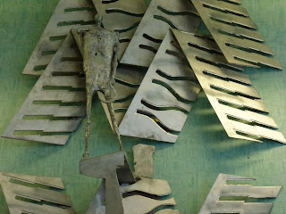 'Your school [Kilrymont] is a blast. Homi Bhaba gives one total license. Is there some kind of Belgian Art Nouveau connection? On the third banner from the left, on the bottom, there is an extremely stylized interpretation of a Kota-speaking peoples' reliquary (Gabon). Every modernist coverted one of these and Picasso had several (poor quality). They are covered with brass and sometimes copper (as shown in the face). The hairstyle is unmistakable. But the artist has invented a dancer's body. Perhaps he imagined that it was some kind of mask instead of the decorative head for a reliquary basket? [JH - perhaps he was thinking of his school setting...] On the right hand group of three banners, on the left-most banner, there is a stool supported by a female caryatid figure with raised hands. This is clearly a highly stylized interpretation of a Luba stool (Democratic Republic of Congo/then Belgian Congo).... '